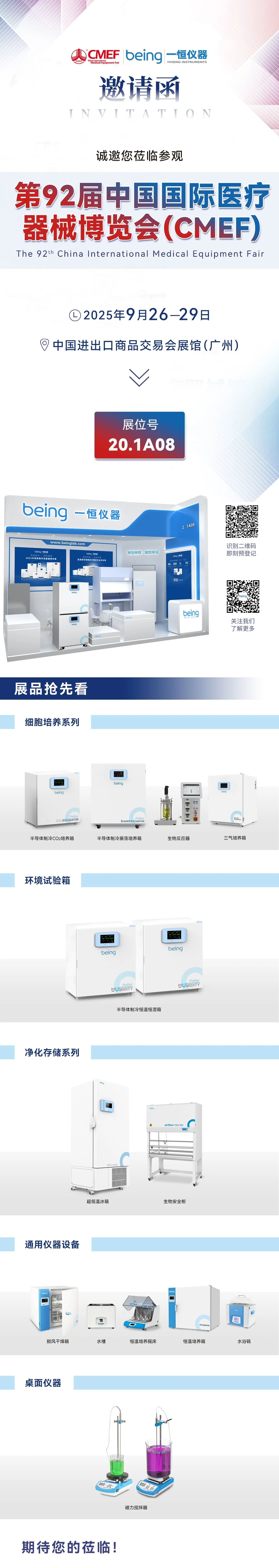 本次展会我们将携多款品牌重磅产品亮相,集中展示生物反应器、三气培养箱、半导体制冷系列设备、生物安全柜、超低温冰箱、恒温培养摇床、水浴锅、水槽、鼓风干燥箱、恒温培养箱、磁力搅拌器等产品。